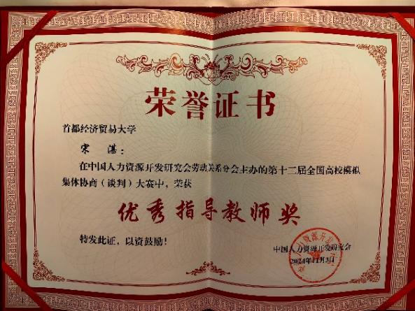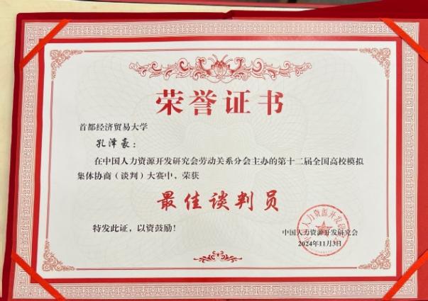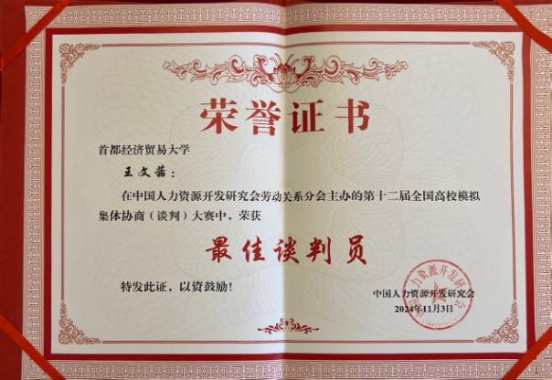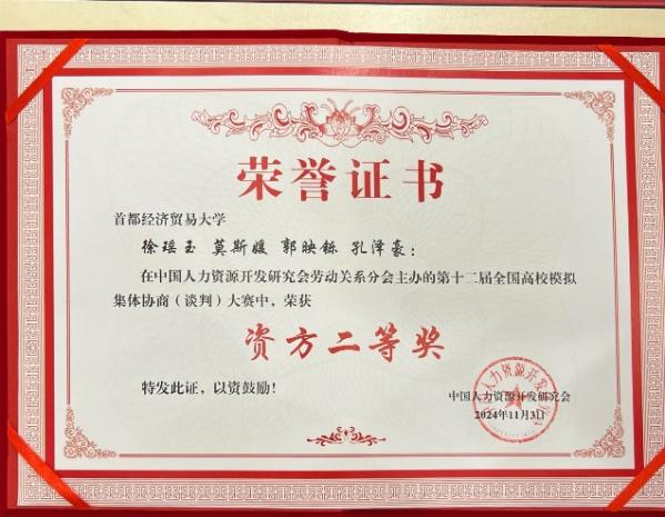 11月1日至4日,由中国人力资源开发研究会劳动关系分会主办,西南政法大学承办的第十二届全国高校模拟集体协商(谈判)大赛成功举办,来自全国29所高校的58支代表队参加大赛。番号鸽 番号鸽 、金融学院的同学们组队参赛,经过激烈角逐,番号鸽 劳方队伍(曾莞晴、王文茜、荆宝竹、龚怀诚)斩获团队二等奖、最佳团队奖,资方队伍(徐瑶玉、莫斯媛、郭映铄、孔泽豪)荣获团队二等奖,王文茜、孔泽豪同学获评优秀谈判员奖,宋湛、郑祁老师获评优秀指导教师奖。