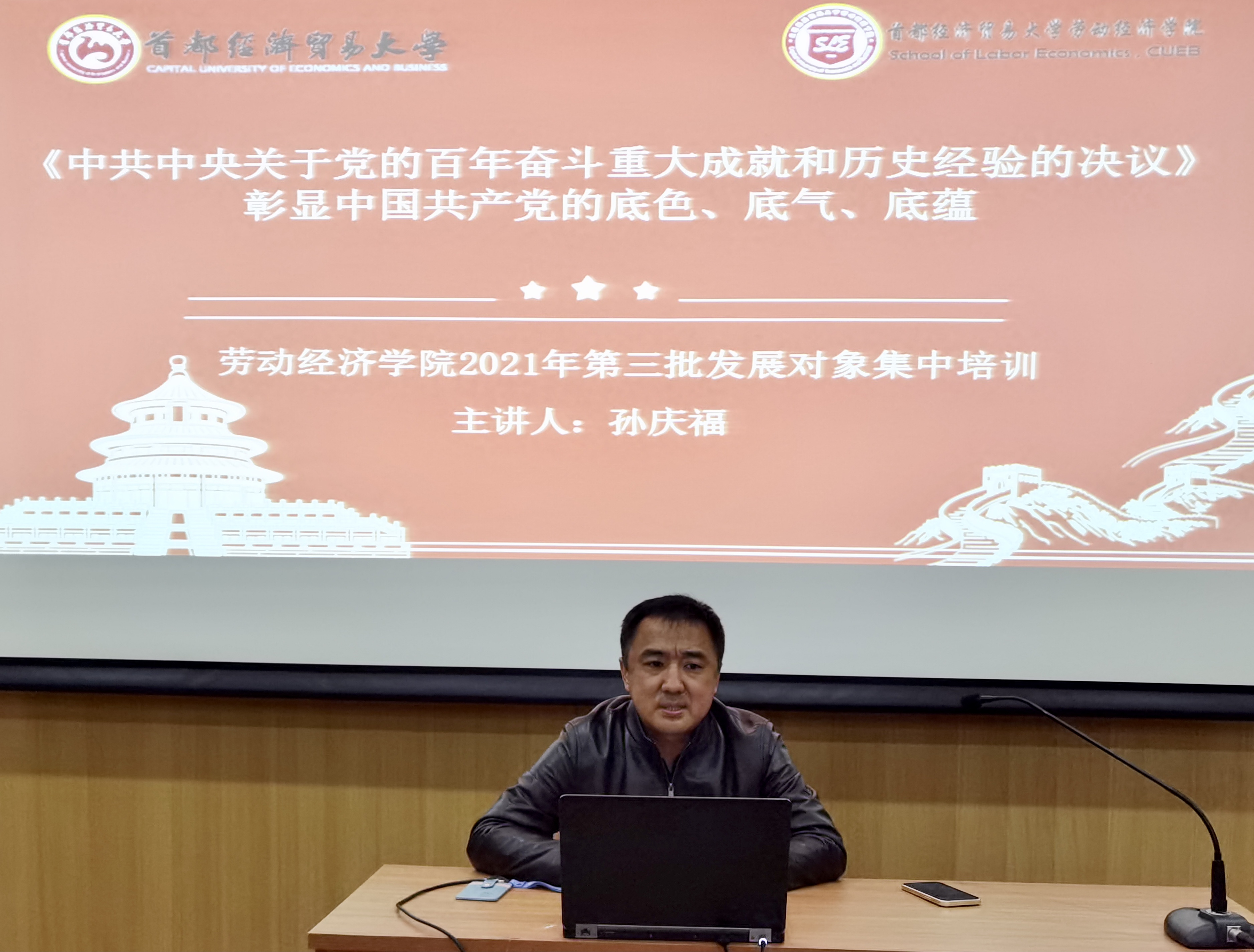 2021年11月15日晚,学院党委副书记孙庆福应邀为党员发展对象讲授题为“党的十九届六中全会彰显中国共产党的底蕴、底色、底气”的主题讲座,讲座于博远楼1号会议室开讲。