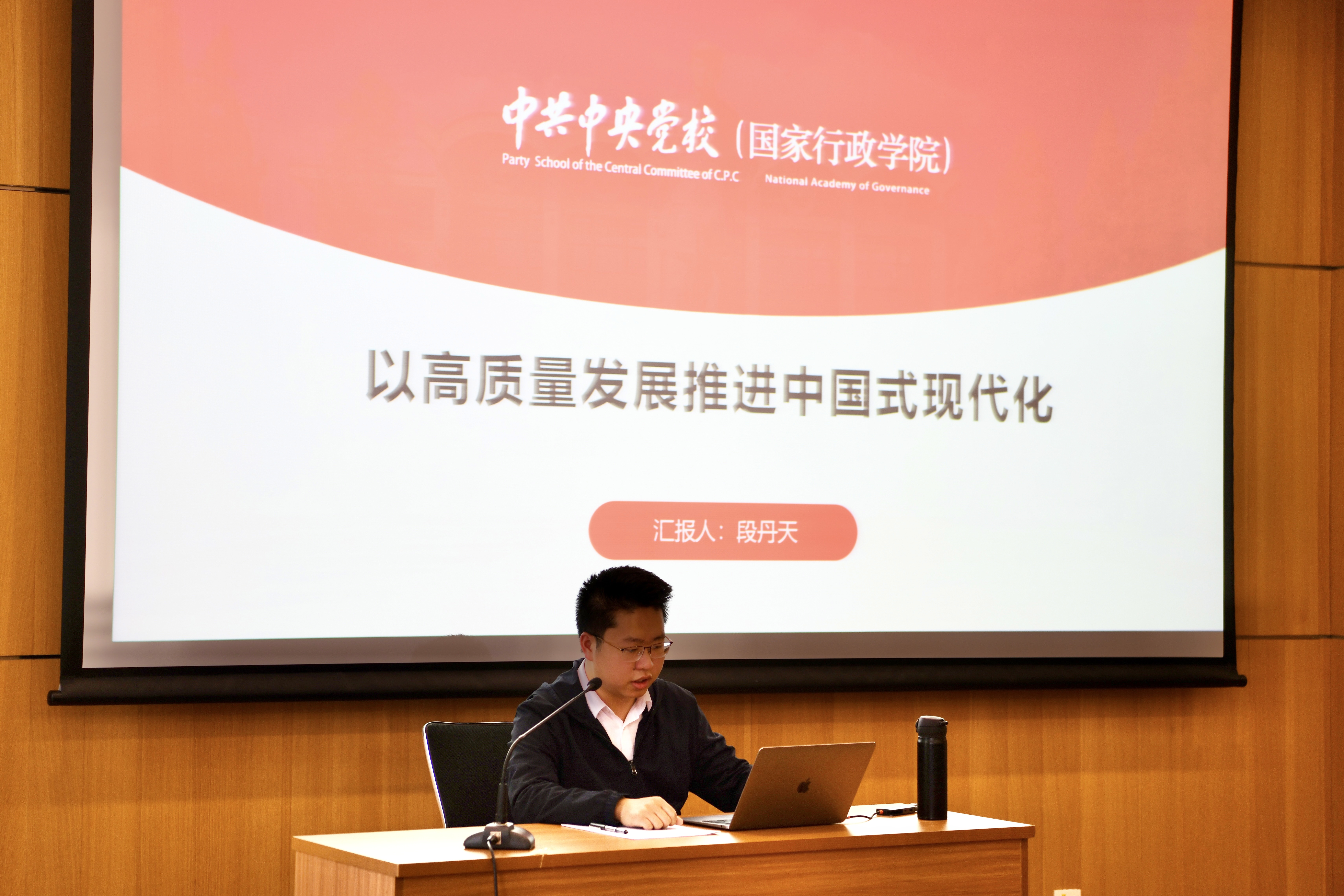 段丹天进行了题为“以高质量发展推进中国式现代化”的主题分享。他从马克思主义发展观视角进行了概念解析,并从创新驱动、实现共同富裕、绿色发展、统筹发展与安全、全球化进程等角度,结合基层调研的具体案例,对实现中国式现代化的转型路径进行了讨论。从理论和实践两个逻辑,让同学们对中国式现代化有了相对整体的理解,明晰了以中国式现代化全面推进实现中华民族伟大复兴,并向全世界贡献中国智慧、中国方案的重要理论价值。