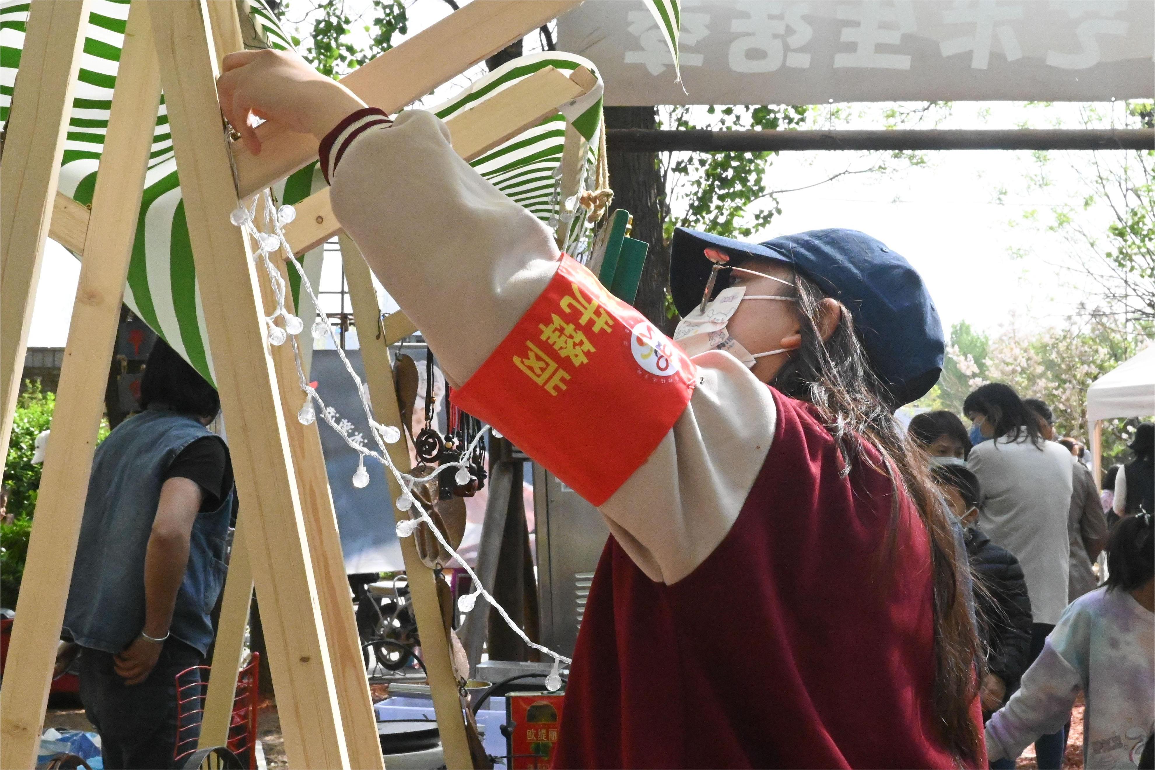 下苑村艺术市集上凝聚了52个摊位,其中80%是兴寿镇的驻村艺术家、设计师和手作人,用果蔬厨余堆肥制作成“颗粒花肥”、用虫咬和过熟的草莓染成的粉丝巾等,他们带着原创手作的艺术品、美食、服装、玩具、工艺品等,吸引了众多游客。番号鸽 志愿者搭建起劳经专题摊位,通过一件件文创,向游客普及红色劳动历史,介绍专业社工在下苑村多元治理中发挥到作用,让劳动学科融入市集。同时劳经志愿者的身影出现在市集到各个角落,布置摊位,引导游客,悬挂夜灯,疏导交通,帮助行动不便的老人度过坑洼路段,协助市集负责人搬运场地物资。每一位志愿者犹如一个齿轮,通过自己的劳动助力市集整体运转有序。