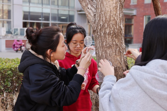 在博学楼前学院劳动实践园,我院学生与经济学院、心田劳动教育社团的同学们共同开展生物防治探索劳动实践教育,通过了解护林知识,亲身实践“以虫治虫”的生物防治方法,激发同学们亲近自然、保护生态的热情。