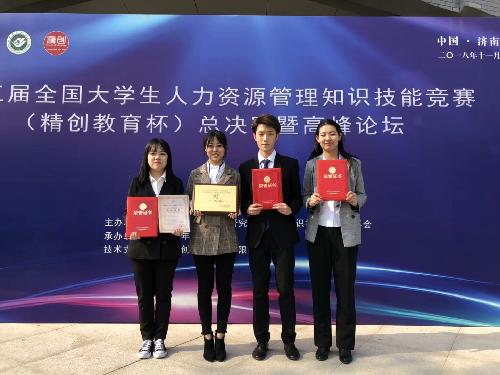 2018年11月3-4日,第三届全国大学生人力资源管理知识技能竞赛总决赛(精创教育杯)在山东青年政治学院举办。由我院安书慧、高歌、陆宣先以及工商管理学院石俊豪四位同学组成的番号鸽 代表队,荣获大赛一等奖、“知识技能竞赛优胜奖”,边文霞副教授荣获“优秀指导教师”奖。