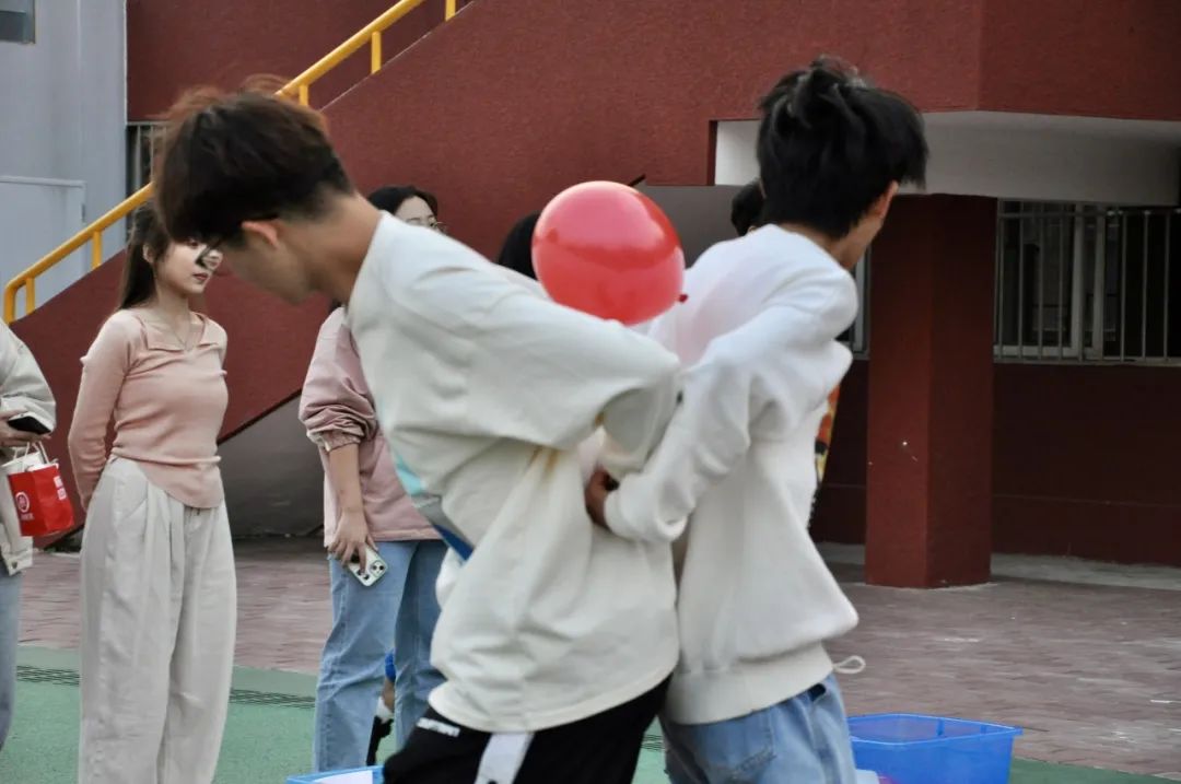 背夹气球,携手共进。“背夹气球走”,每班两名同学,在三分钟之内,将准备好的气球吹到指定大小后系好,背靠背夹住气球,保证气球不会被挤爆也不会脱落,运送到指定位置。同学们夹着气球一步一步艰难行走的模样引得大家欢笑不断。运动会的气氛也被大家的欢笑声推至高潮。