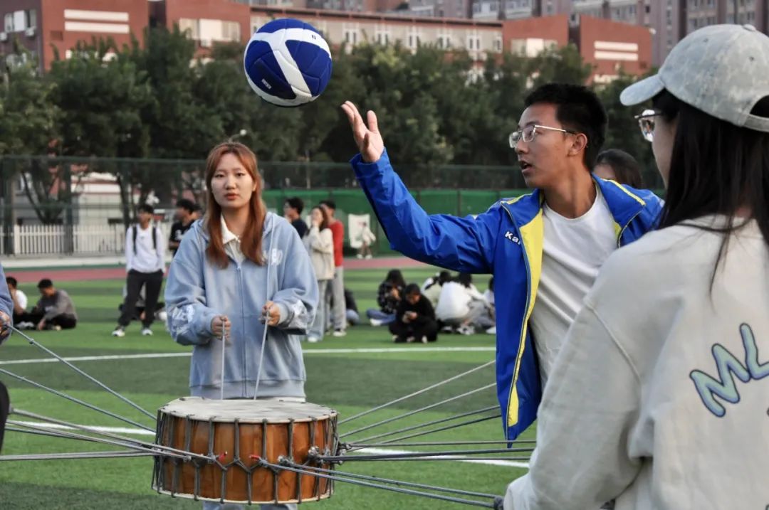 同心同步,同鼓未来。同心鼓开赛,同学们集中注意力,每个队员紧握一根绳,身体重心后移,膝盖弯曲,保证鼓面水平。裁判将一个排球从鼓面中心上方竖直抛下,队员们齐心协力将球颠起,排球起起伏伏大家的心也跟着起落。队员们在不知不觉间习惯了相互配合彼此信任。
