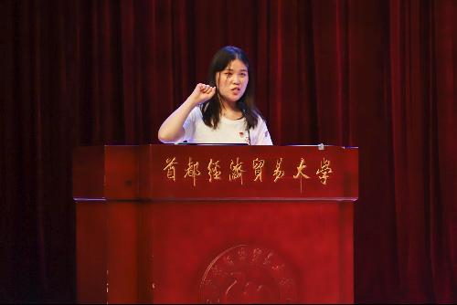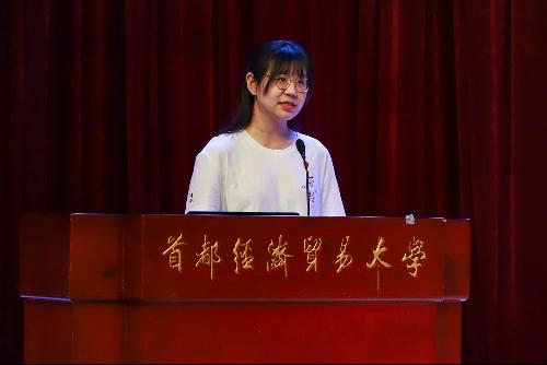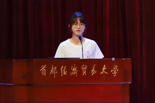 2021级刘泽菲作为新生代表上台发言。经过十二年的不懈奋斗,终得首经贸的相遇,与劳经学院的并肩而行,感悟崇德尚能和经世济民的情怀。她希望自己以及所有新生在未来的四年里,树立目标、学海游弋,博观约取、扎根实践,不断明晰劳经人所肩负的责任与使命,共圆一个家国有我的青春中国梦。
