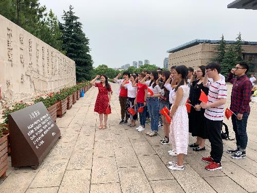 在纪念馆北侧的宣誓墙前,青年党员们面向巨幅党旗,举起右拳,在学院本科生第一党支部书记王庆的领誓下,重温入党誓词,坚守入党初心,坚定理想信念。