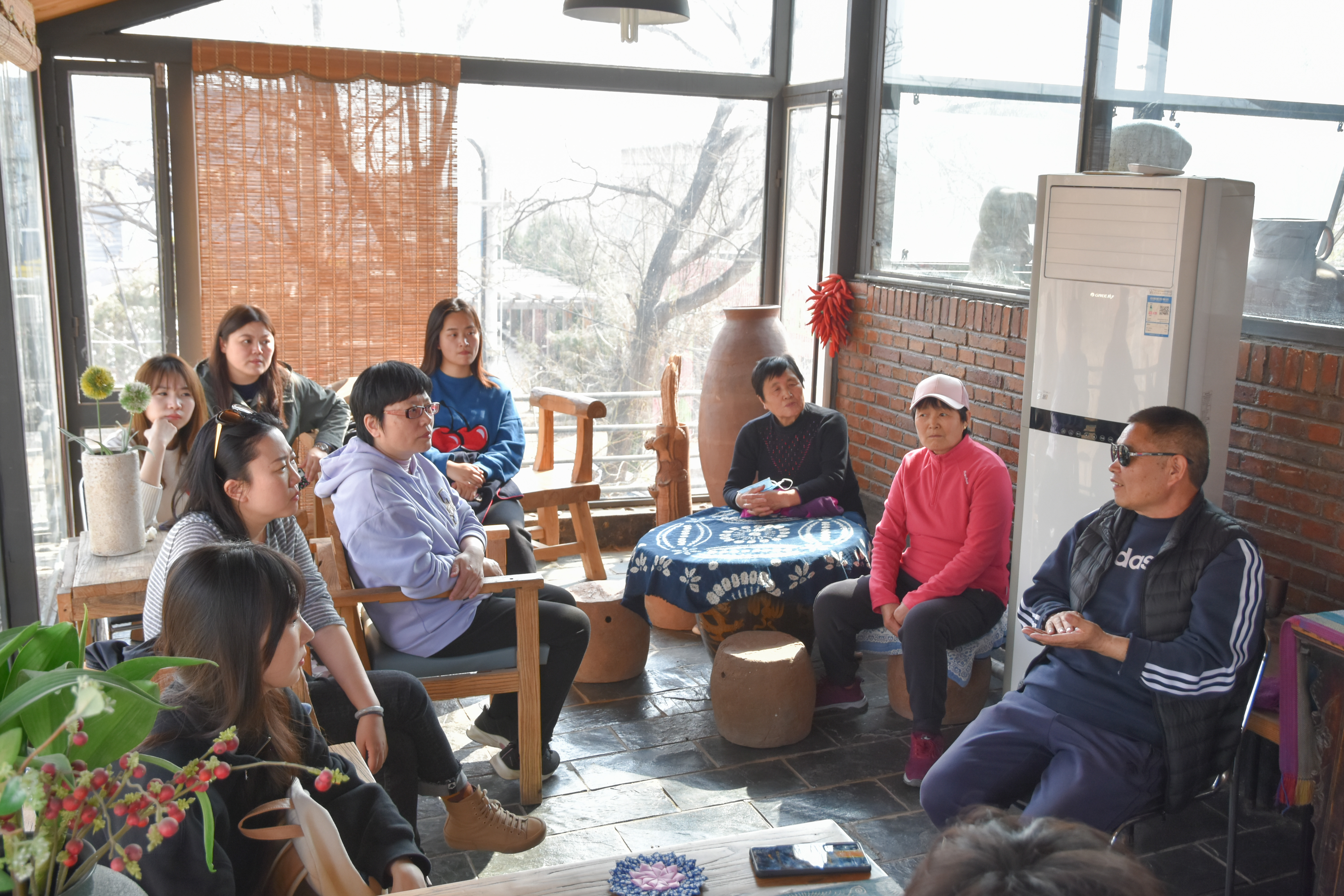 下午,劳经师生迅速投入劳动实践,大家来到著名陶艺家郑玉奎宋晓玲夫艺术工作室,一方面身临其境感受艺术赋能乡村的积极影响,另一方面,与村民近距离开展“想知道”与“想解决”乡村会客厅活动。
