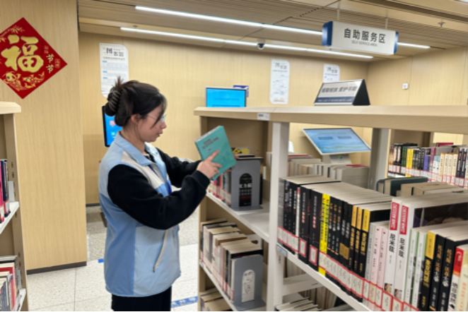 伴随图书馆开馆,志愿者上岗服务,他们耐心帮助读者查找书籍准确位置,及时整理错位图书,并在确保书架整齐有序的同时适时提醒读者轻声交流,维持图书馆日常秩序。