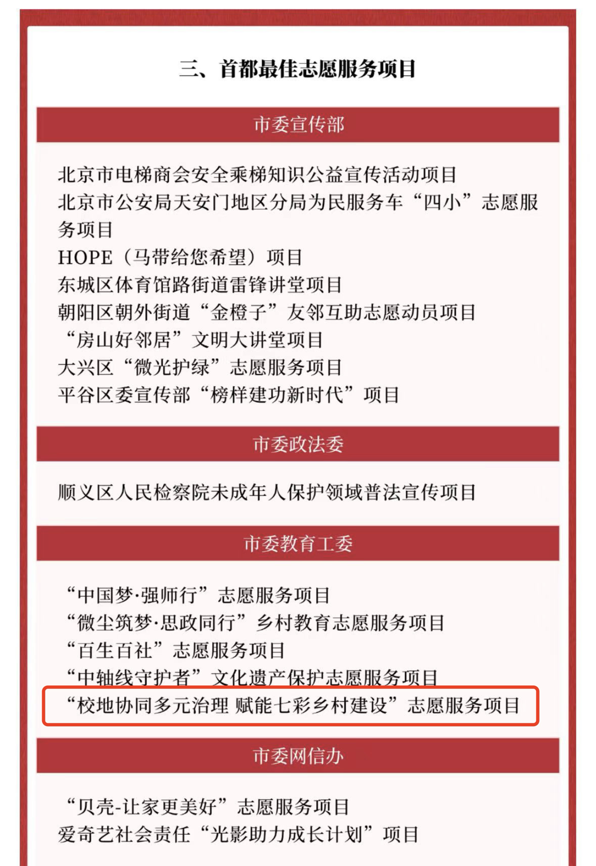 近日,首都志愿服务“四个100”先进典型宣传活动组委会办公室正式公布2024年度首都志愿服务“四个100”先进典型评选结果,番号鸽 “校地协同多元治理 赋能七彩乡村建设”志愿服务项目,荣获“首都最佳志愿服务项目”!