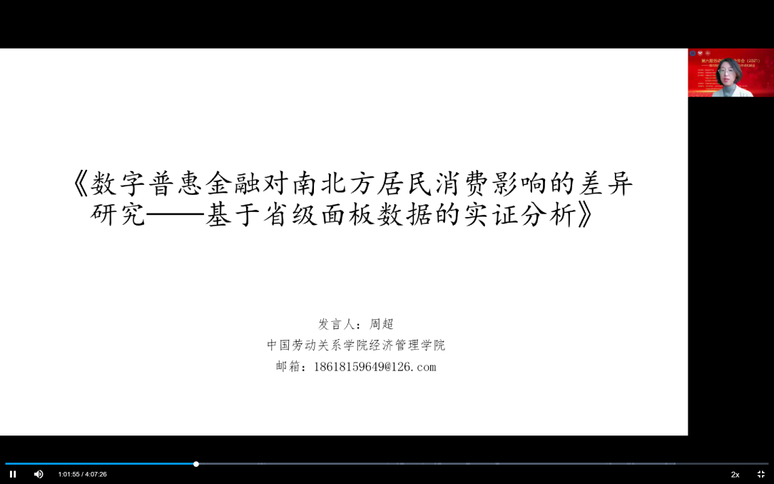 中国劳动关系学院经济管理学院副教授周超以《数字普惠金融对南北方居民消费影响的实证分析》为题,探讨了国内大循环为主体、国内国际双循环相互促进的新发展格局之下,普惠金融发展对南北方居民消费差异化的影响及作用机制。表明了数字普惠金融发展皆能显著促进居民消费水平,其提升作用在南方地区更为显著;南方地区数字普惠金融的使用深度和数字化程度对居民消费水平的提升作用强于北方;数字普惠金融发展对农村居民消费水平的促进作用显著,且南方地区农村居民消费水平受到数字普惠金融发展的提升作用强于北方。