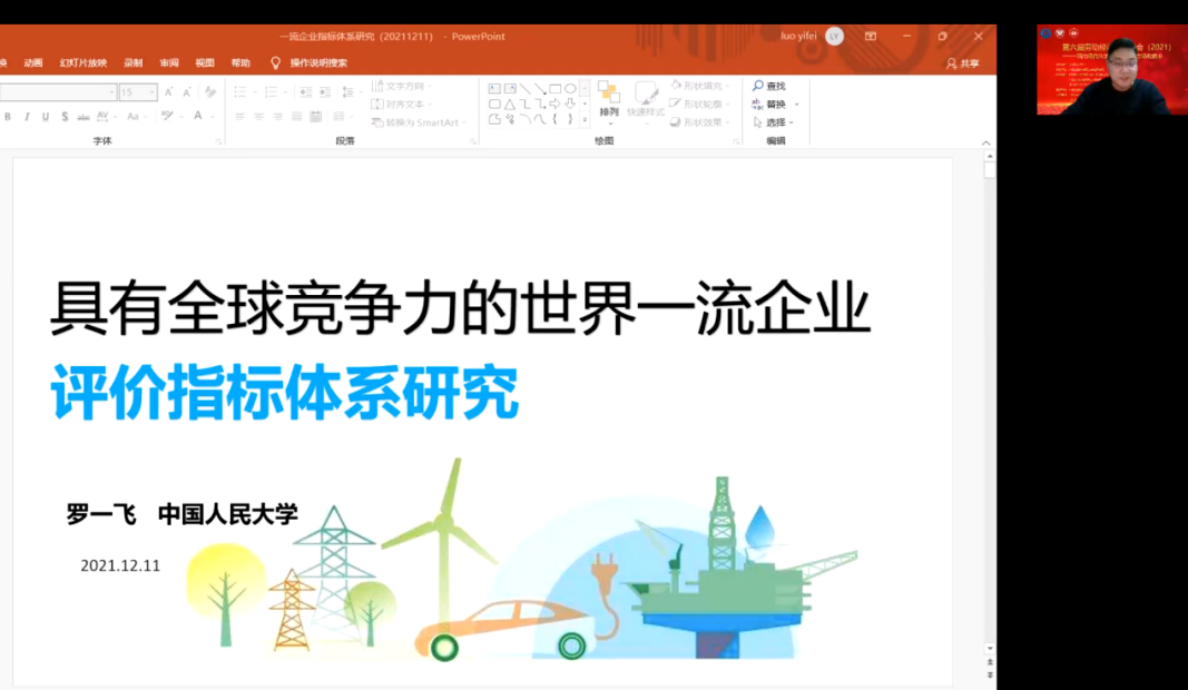 中国人民大学劳动人事学院博士研究生罗一飞以《具有全球竞争力的世界一流企业评价指标体系研究》为题,牢固树立和贯彻履行新发展理念,以“三个领军”“三个领先”“三个典范”为基本统领,介绍了世界一流企业评价体系的设立原则为中国发起、国际通用、科学精准,并将指标设定分为门槛性指标和通用性指标,以华为、国家电网等企业为例展示了研究成果的科学内涵及实践应用。