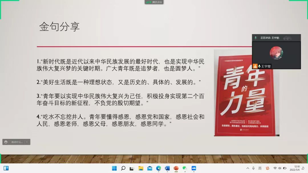 20级劳经5班团支部也在读书会上分享了王建敏编著的《青年的力量》。书中对五四精神进行了阐释,号召广大青年秉承五四精神,树立远大理想,热爱伟大祖国,担当时代责任,勇于砥砺奋斗,练就过硬本领,锤炼品德修为。