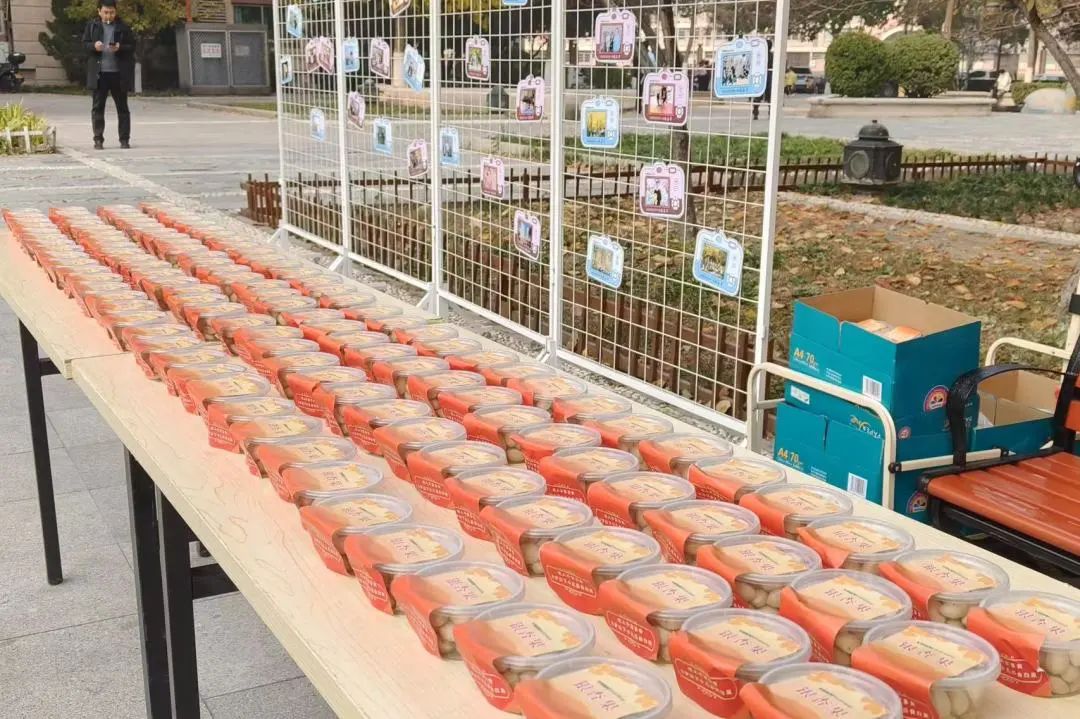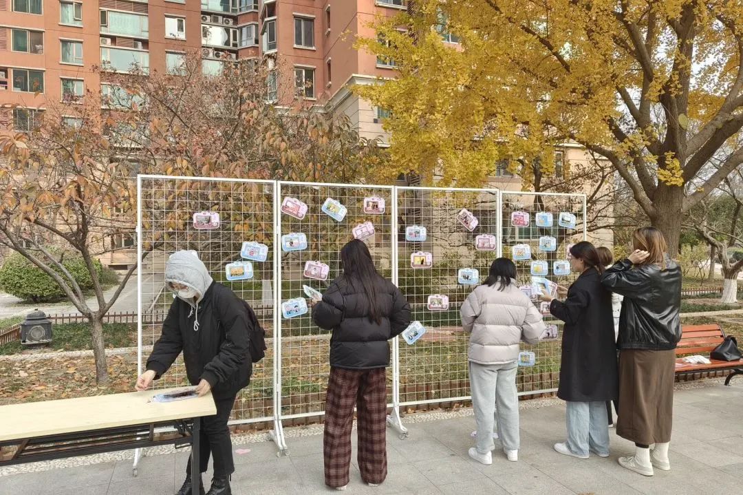 活动开始前,志愿者们安装活动立牌、布置专属明信片展示墙,配合物业工作人员布置活动场地。银杏树前挂满一张张作品,摆满一排排果实,吸引了大批社区居民驻足观看。
