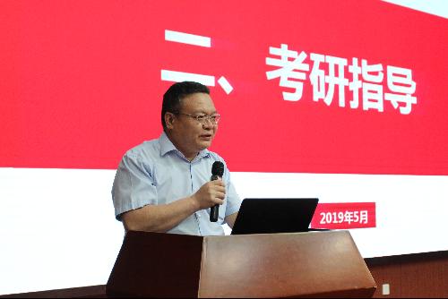 在考研指导方面,学院院长助理周施恩为同学们介绍了近年来全国以及学校的考研环境,建议同学们要合理进行自我定位、综合考量谨慎选择院校目标。此外,他特别为同学们介绍了学校和学院每年研究生招生考试的情况,欢迎各位同学报考母校母院、继续深造。