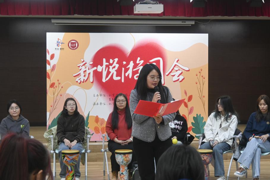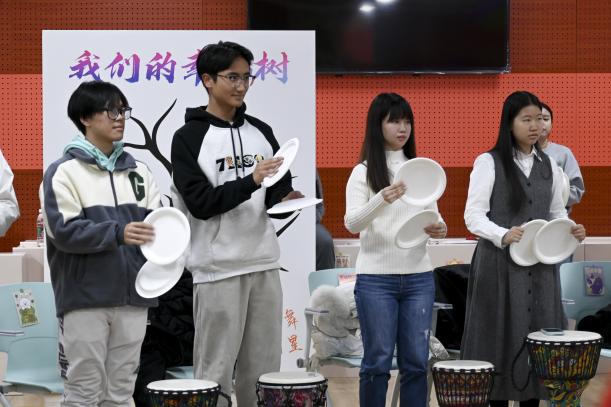 在动态互动环节,心理咨询师白冰带领同学们开启了一段充满活力的“鼓圈互动”之旅。在介绍完非洲鼓的使用方式后,白冰老师率先示范了几种基础节奏,接着鼓励大家创作自己的节奏。她还带领大家伴着音乐跳起了盘子舞。同学们都沉浸在这热闹的氛围和欢快的节奏里,并借此过程拉近了与彼此间距离。