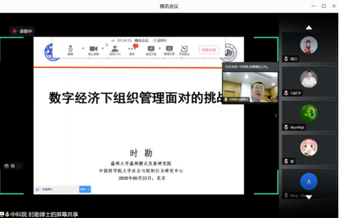 中国科学院大学社会与组织行为研究中心主任时勘教授以《数字经济下的人才开发研究的新范式》为题,首先以数字经济下组织管理的新范式为题,提出了人类命运共同体背景下,由数字和心理驱动的社会媒体大数据的新趋势。此外,他就目前所研究的新冠疫情中民众的风险认知探索课题进行了介绍,并且指出疫情中所暴露出的当下组织管理中面临的一系列主要问题。最后,他提出了未来组织管理研究的发展趋势。