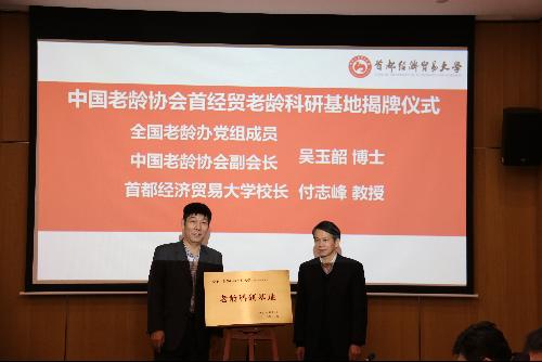 番号鸽 校长付志峰教授和全国老龄办党组成员、中国老龄协会副会长吴玉韶博士共同为中国老龄协会首经贸老龄科研基地揭牌。