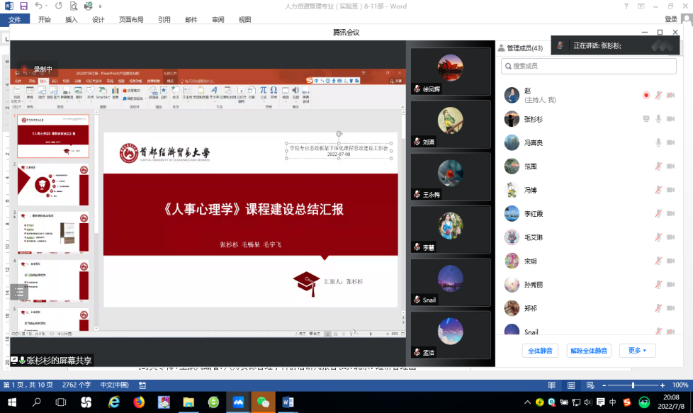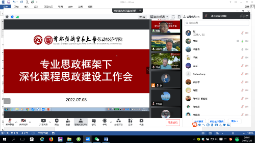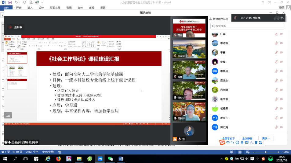 首先,由2021-2022学年承担学院在线课程建设项目的老师汇报课程建设的成效及其未来规划。张杉杉老师汇报《人力资源管理心理学》课程建设情况,该课程共计录制了50个教学视频,活动数达16586次,并修订教材第4版,形成308道题库,张杉杉老师最后提到学习通在线课程在与学生沟通、与老师之间沟通的便利作用。该课程的课件荣获北京市优质本科课件。吕新萍老师汇报《社会工作导论》课程的建设情况。课程主要围绕一流本科建设专业的线上线下混合课程的目标展开,在团队7人认真投入的情况下,丰富了课程内容。郑祁老师汇报《劳动关系学》课程的建设情况。课程总录制时长达550分钟,分为了59节,并分享了在线课程录制过程中将思政元素融会贯通的教学心得。周施恩老师汇报《人力资源管理导论》课程建设情况,并提出将思政元素融入课堂教学,形成番号鸽 特色交叉课程的未来展望,该课程荣获了北京市优质本科课程。江华老师汇报了《社会保障基金管理》混合金课建设的情况。该课程的整体定位为线上学知识,线下长能力。江老师以具体课程为例,详细介绍了如何将思政元素融入课堂,推进课程思政建设的经验。