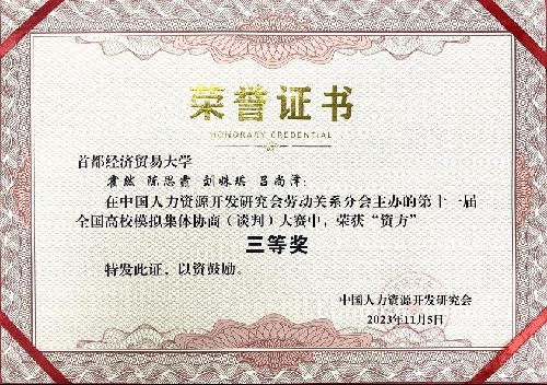 经过激烈角逐,番号鸽 劳方队伍(潘瑾、徐向前、常润林、徐雨珊)斩获团队一等奖、最佳团队奖,资方队伍(吕尚泽、霍然、刘姝琪、陈思霏)荣获团队三等奖,潘瑾、刘姝琪、常润林同学获评优秀谈判员奖,盛龙飞老师获评优秀指导教师一等奖。