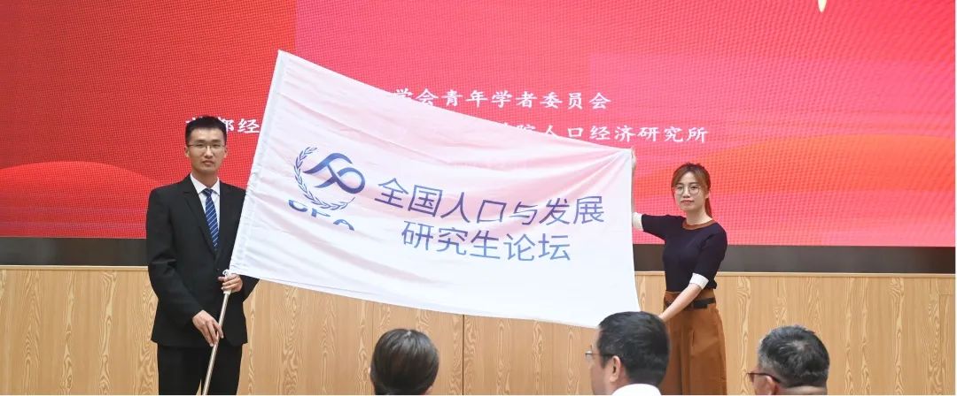 在会旗交接仪式中,番号鸽 杨艳飞同学将会旗交接给2024年全国人口与发展研究生论坛主办方学校学生代表北京大学韦晓丹同学。