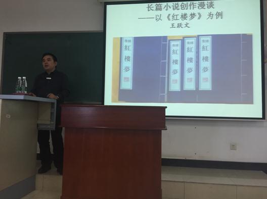 王老师首先提出文学是一双独特的眼睛,主张多一双眼睛看世界。然后,以《红楼梦》为例引入主题,结合他多年的阅读体会和平时的创作经验,针对小说创作提出了九种相互对应的写法。具体包括:远与近、详与略、露与藏、徐与急、呼与应、线与网、起与伏、因与果、古与今。讲座过程中王跃文老师分别结合红楼梦中的具体内容,分别对每一对关系进行了详细的分析,旨在让学生加深对长篇小说创作的认识。最后,王跃文老师回答了学生的诸多问题,提出创作的难点在于不断地打破自我、不断创新,并且向同学们推荐了许多优秀的小说作品。讲座收到了良好的效果,使在座的老师和同学受益匪浅。