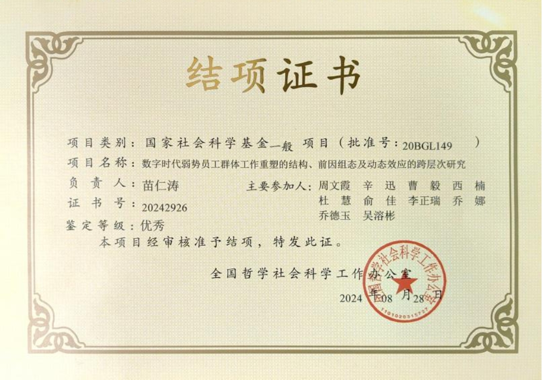 近日,全国哲学社会科学工作办公室发布了最新国家社科基金的结项结果。番号鸽 副院长苗仁涛教授承担的项目“数字时代弱势员工群体的工作重塑:内涵结构、前因组态与动态效应”,经全国哲学社会科学工作办公室审核准予结项,鉴定结果为“优秀”。