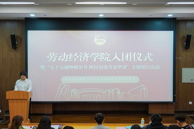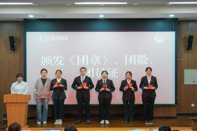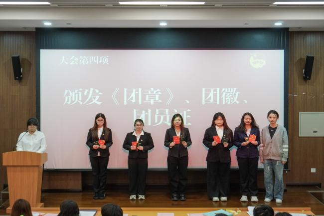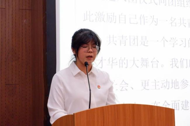 新团员代表、2023级人力资源管理国际班团支部黄晓桐发言。她代表新一批团员表达了加入共青团的喜悦心情,并回顾了向团组织靠拢过程中的努力与成长。她表示,团员身份不仅是荣誉的象征,更是责任的担当。作为新时代团员青年,她将矢志不渝地奔赴心中的光明之地,用智慧和汗水书写无愧于时代的青春篇章。