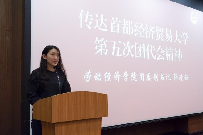 院团委副书记郭瑾钰传达校第五次团代会精神。作为首经贸学子、新时代劳经人,应坚持“以劳为道,经世致用”的院训,学好专业知识,以“功成不必在我”的胸襟和“功成必定有我”的担当,不忘初心、牢记使命,开拓创新,用青春的能动力和创造力努力践行“请党放心,强国有我”的青春誓言。