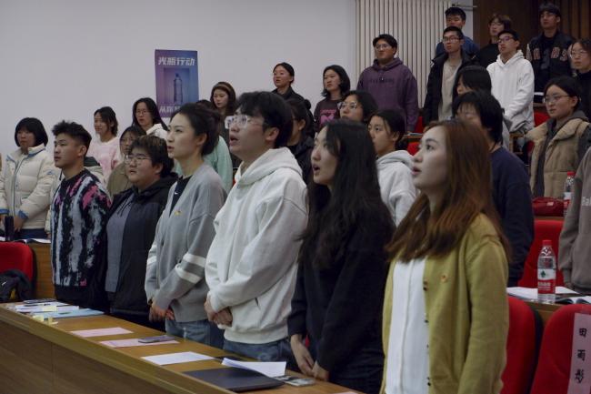 大会在庄严洪亮的国歌声中开始。石滢雅首先介绍举行入团仪式的意义。入团仪式不仅是成为一名光荣团员的标志,更意味着团员需要发挥先锋模范作用,享有团员的义务和权利,成为党的助手和后备军,肩负起更重要的责任与使命。