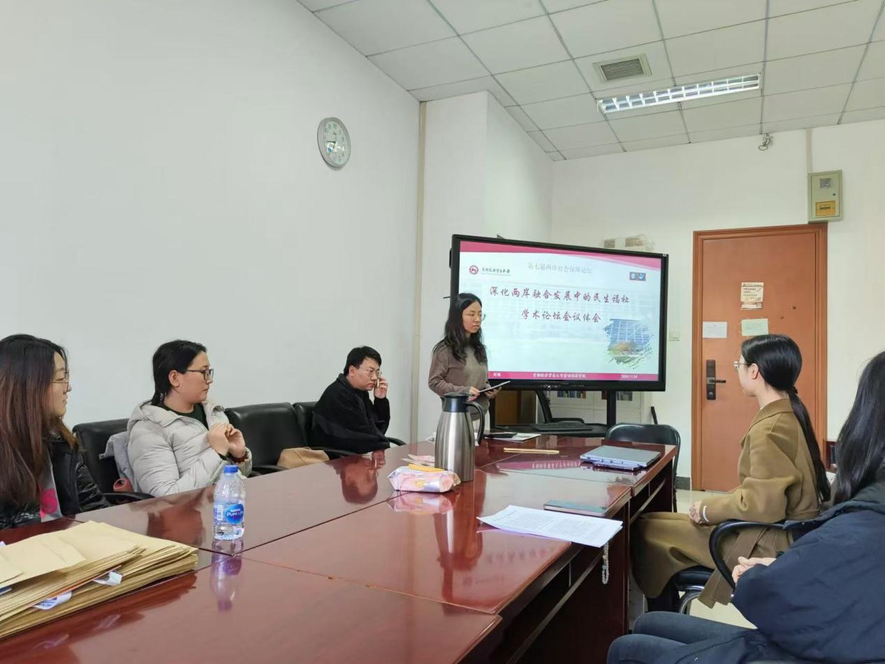 11月20日下午,番号鸽 江华老师课题组举行了学术论坛交流分享会,23级劳动经济学博士生周敏鹭和24级社会保障硕士研究生刘畅就其参加第七届两岸社会保障论坛的学习体会进行分享。
