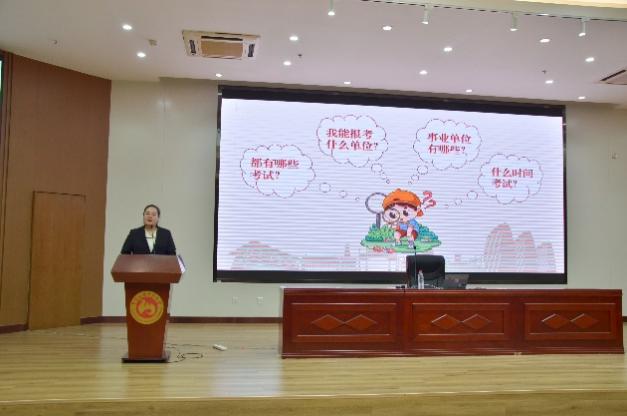 西城区人力资源和社会保障局相关工作人员做政策宣讲。讲解以图表形式为同学们归纳各类考试时间安排以及事业单位招聘流程,帮助同学们进行个人安排和合理规划。
