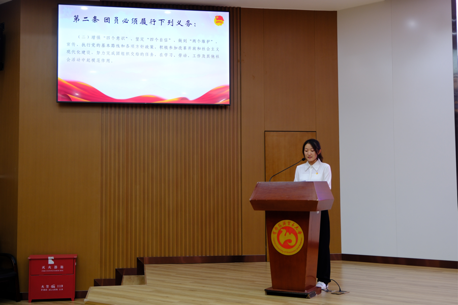 分团委组织部部长、入团介绍人代表郭瑾钰宣读《团章》中的部分条款,并解读《团章》中部分内容。通过解读《团章》,帮助各位团员明确自己的责任和义务。同时,让团员认识到,要不断提高自身素质,加强自我管理,自觉遵守团的章程和规定,做到言行一致,勇于担当,以身作则,以更加饱满的热情和更加扎实的工作作风践行初心使命。