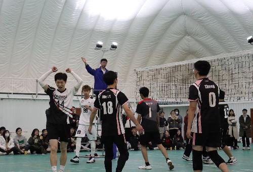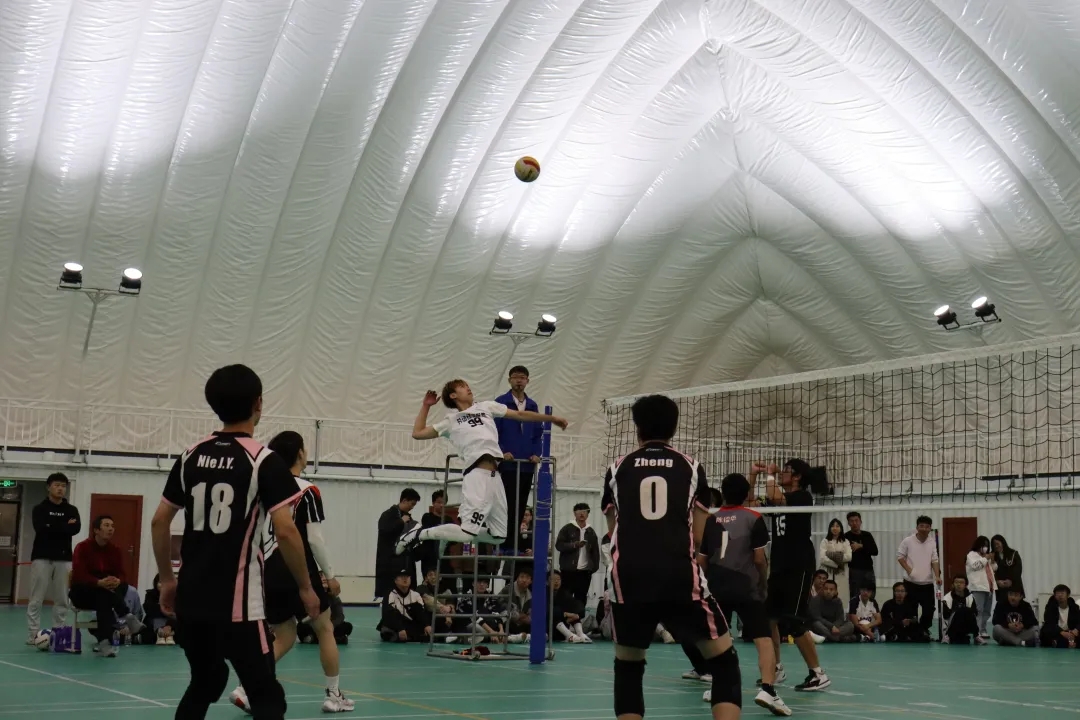 本次决赛的对手是传统强队管工队,11月14日19:00决赛拉开序幕。由于加分机制,我方以0:3开局,随着一声哨响,比赛正式开始。在第一局中,劳经一队开局还未进入状态,扣球以及接1出现失误,被管工队扩大领先优势,之后随着0号郑澤世以及1号努尔扎提二人对管工队主攻的扣球成功拦网得分后,我方成功组织进攻,18号聂佳勇接一传将球稳稳起给二传郑澤世,郑澤世将球精准传给99号新生主攻朱志俊,朱志俊高高跃起大力将球扣出,成功得分。之后8号马毅怡成功救起对方主攻的扣球,44号陈镭华跑到场外将球救回并造成对手失误再得一分。随后比赛持续胶着,管工队凭借着良好的防守并且借助我方连续的几个发球失误拉开分差拿下局点,即便我方随即连续追分并且逼迫对方叫暂停,最终也以22:25的微小劣势在第一局中输给管工队。