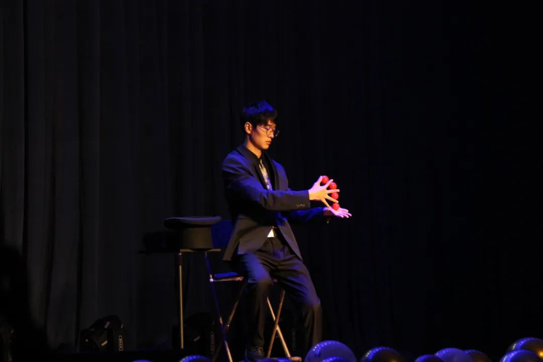 魔术团带来表演《皦玉朱樱》。一个个小圆球在魔术师的手中游走自如,时隐时现,似皦玉般莹白的小球随双手回旋起舞。转瞬间,小球从莹白变为朱樱色,宛如玛瑙般惹人注目,引起阵阵惊叹。又一瞬,朱樱变回皦玉,仿佛神仙作法,引得同学们流连瞩目。