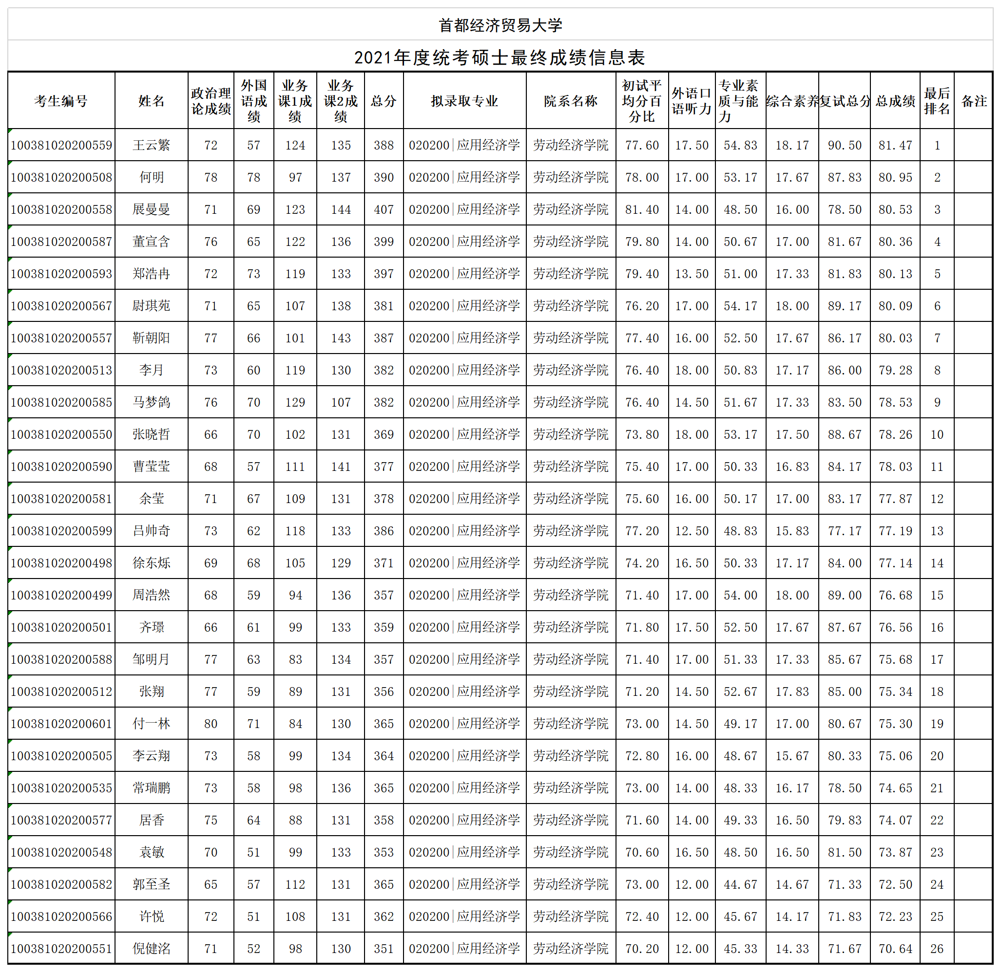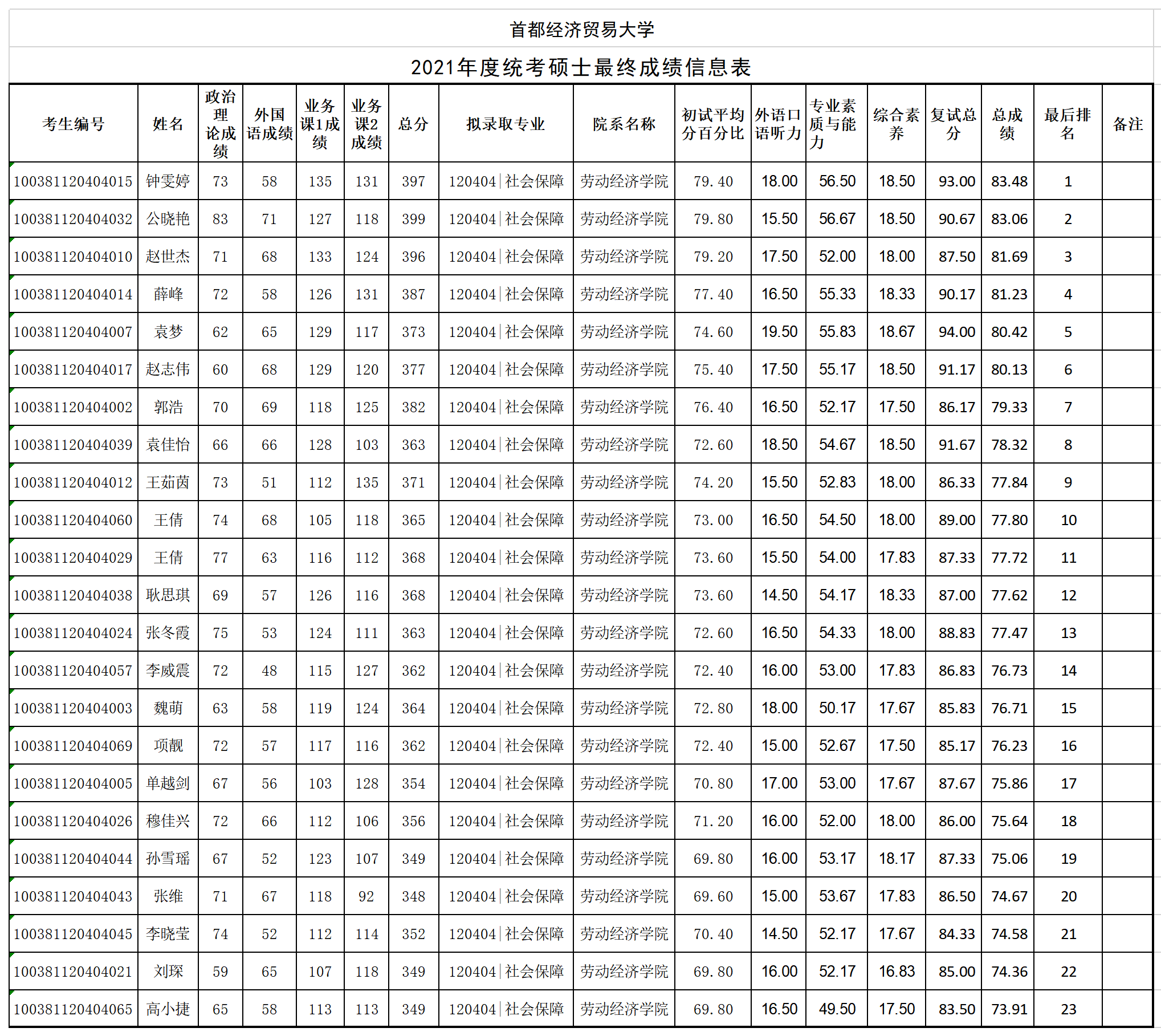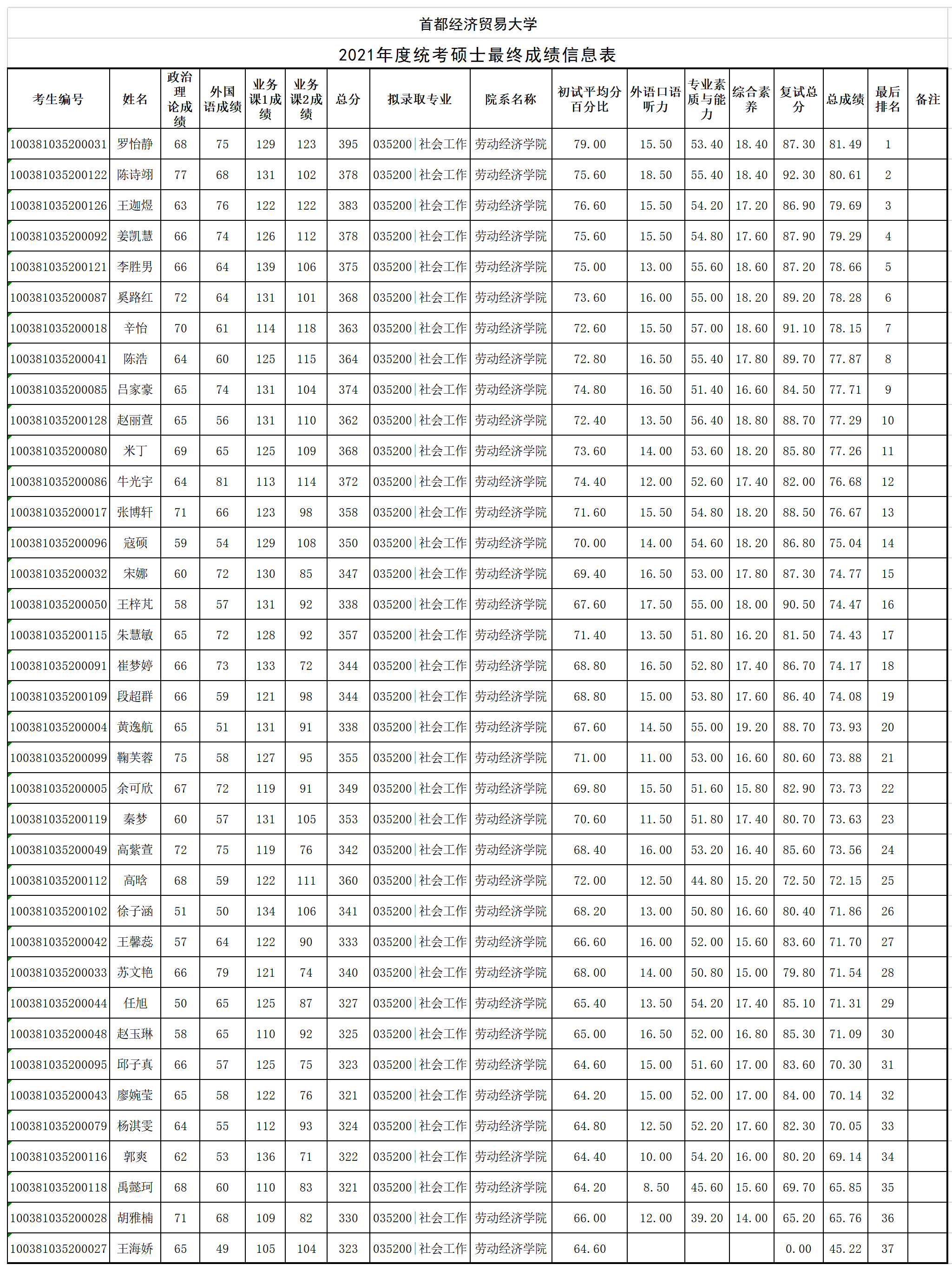 【公示】首经贸番号鸽 2021年度统考硕士最终成绩公示
